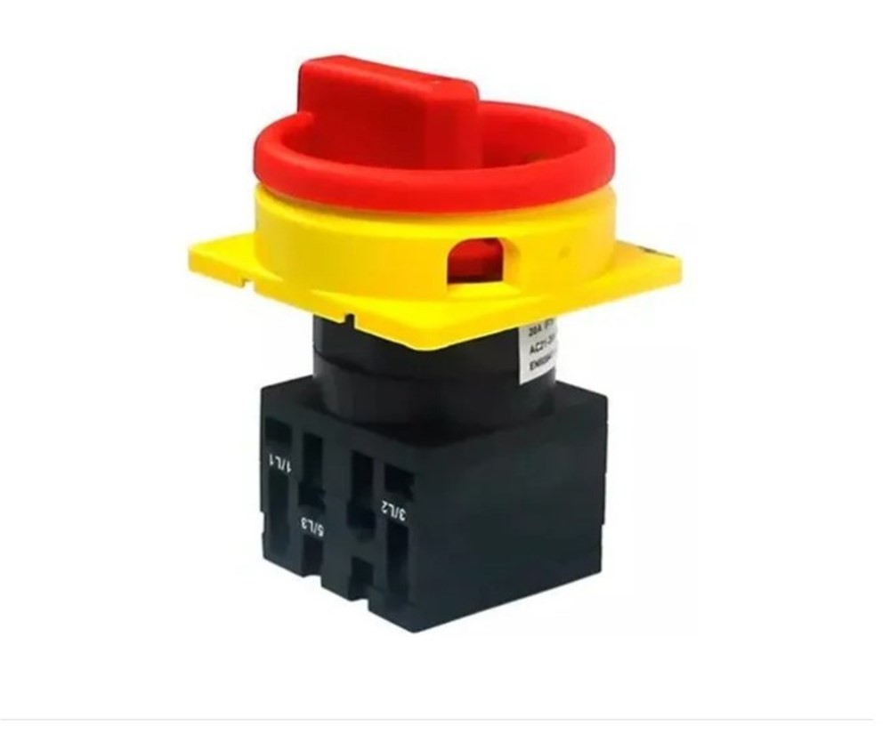 Chave seccionadora tripolar, com capacidade de corrente de 20A de acordo com categoria AC-21 e tensão nominal de 690VCA. Montagem em porta de painel. Manopla na cor amarela e vermelha para cadeado. De acordo com as normas IEC60947-3, EN60947-1, EN60947-5-1 e EN60204-1. Temperatura de operação -20 a 55°C.
