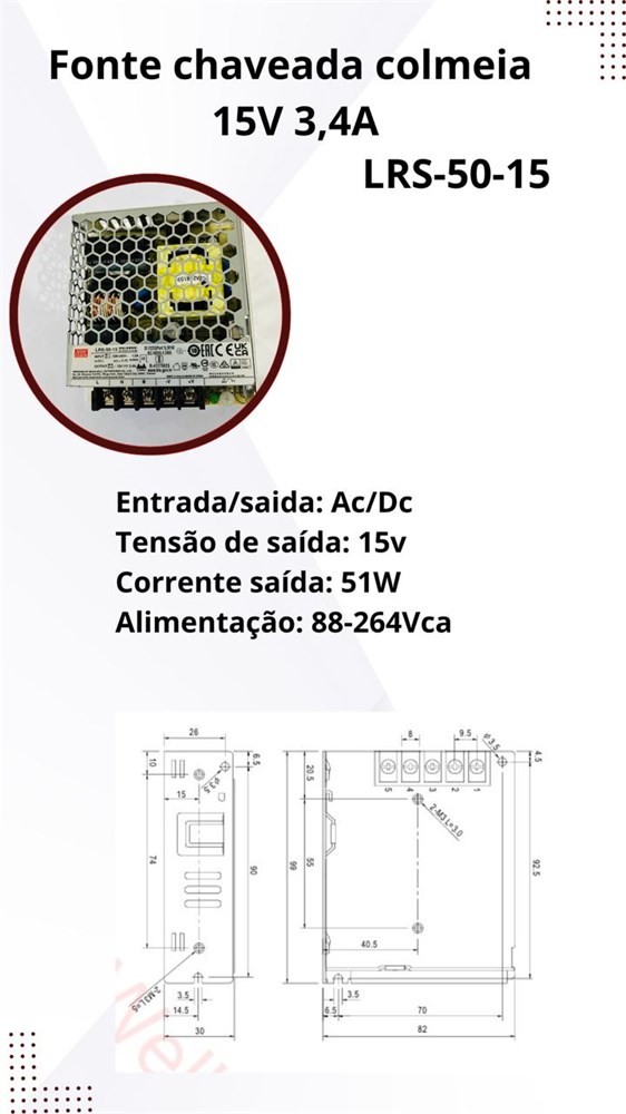 Fonte Chaveada Colmeia de Alimentação 15V LRS-50-15 Mean Well – 50W