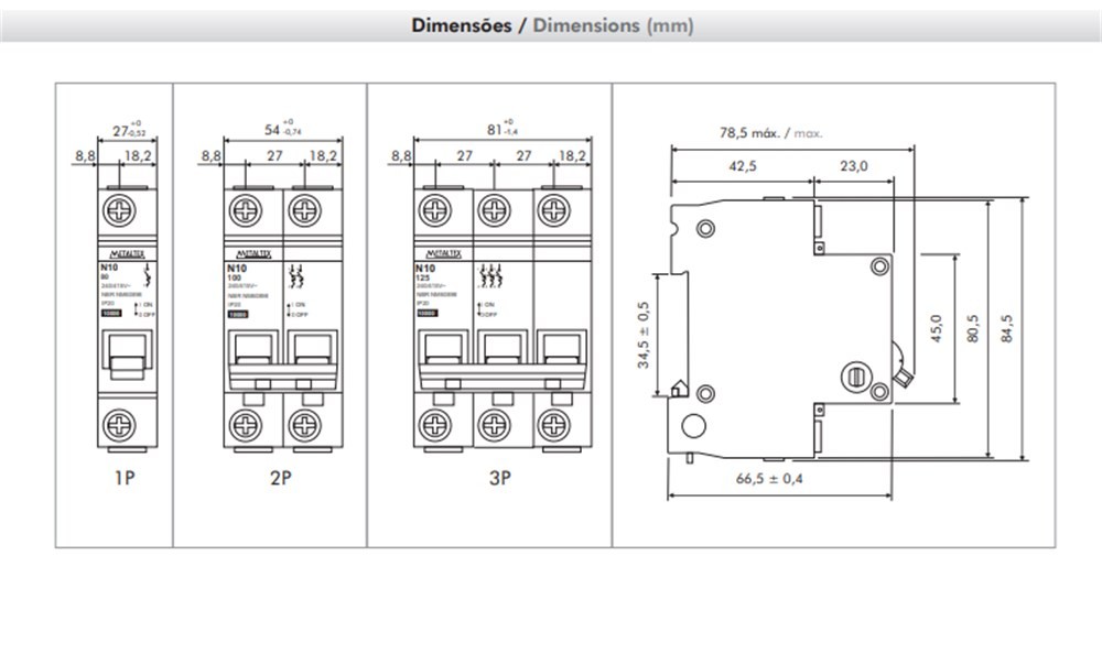 N10-3P100 MINI DISJUNTOR 10KA TRIPOLAR CURVA C 100A METALTEX